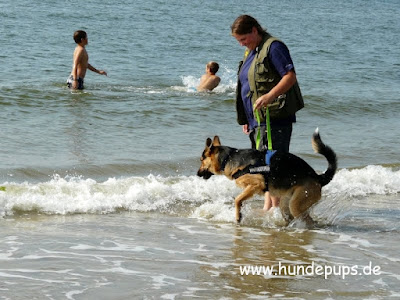 Mit Frauchen habe ich mich ins Wasser getraut. Als die Wellen kamen bin ich lieber Richtung Land gehüpft:
